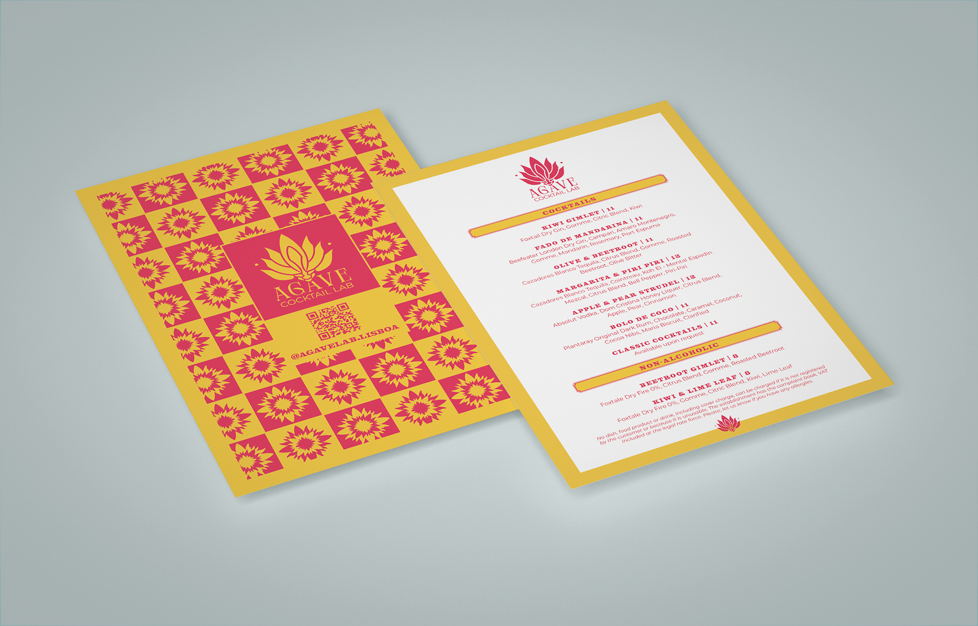 Logo Development, Brand guidelines, signage and menus for a new cocktail bar opening in Lisboa, Portugal. Elegant fonts were paired with a fresh, vibrant palette to create a bold, elevated identity. A bespoke pattern made from the logo shape and inspired by the tile art famous to both Mexico and Portugal, further enhances the feeling of bold fun in a way that pays homage to the cultural flavours and inspiration behind this bar.