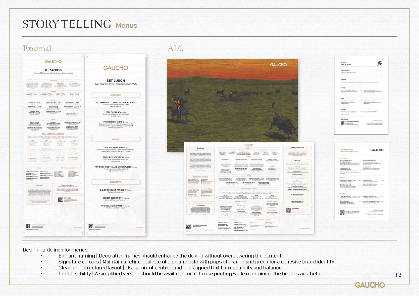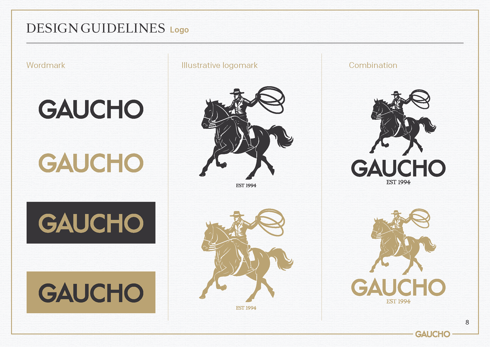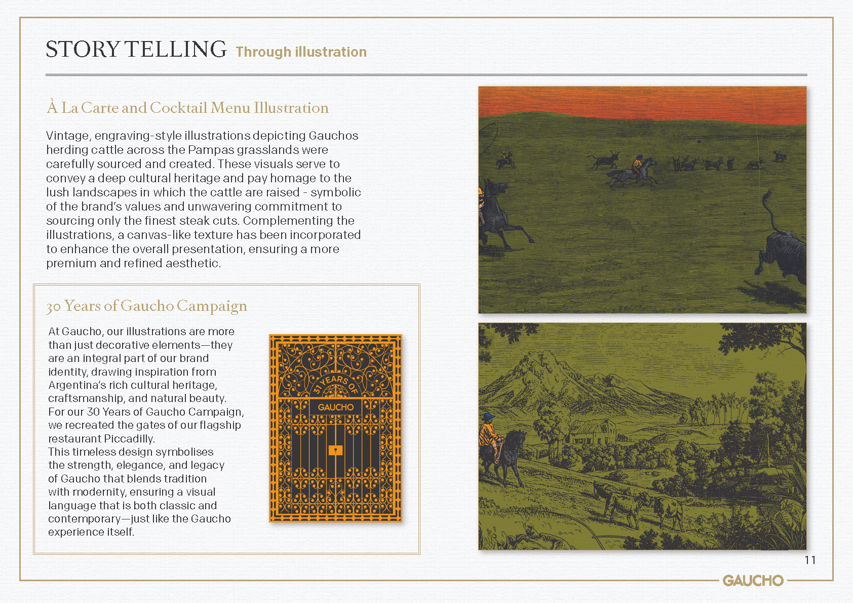 This evolution of Gaucho's branding was designed to better showcase the brand's rich heritage and improve visual storytelling. To achieve this, an illustrative logomark was created to better communicate the idea of the typical Argentinian Gaucho, a clear nod to the origin and inspiration behind the restaurant group. This was combined with a refreshed colour palette that speaks to the earthy richness and sunshine vibrancy of Argentina.