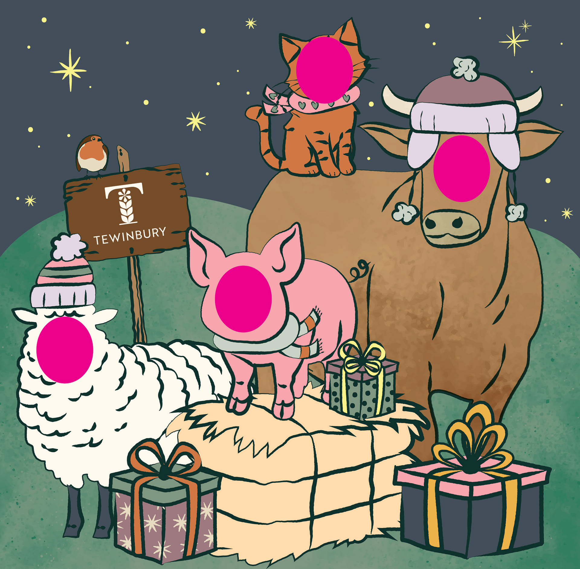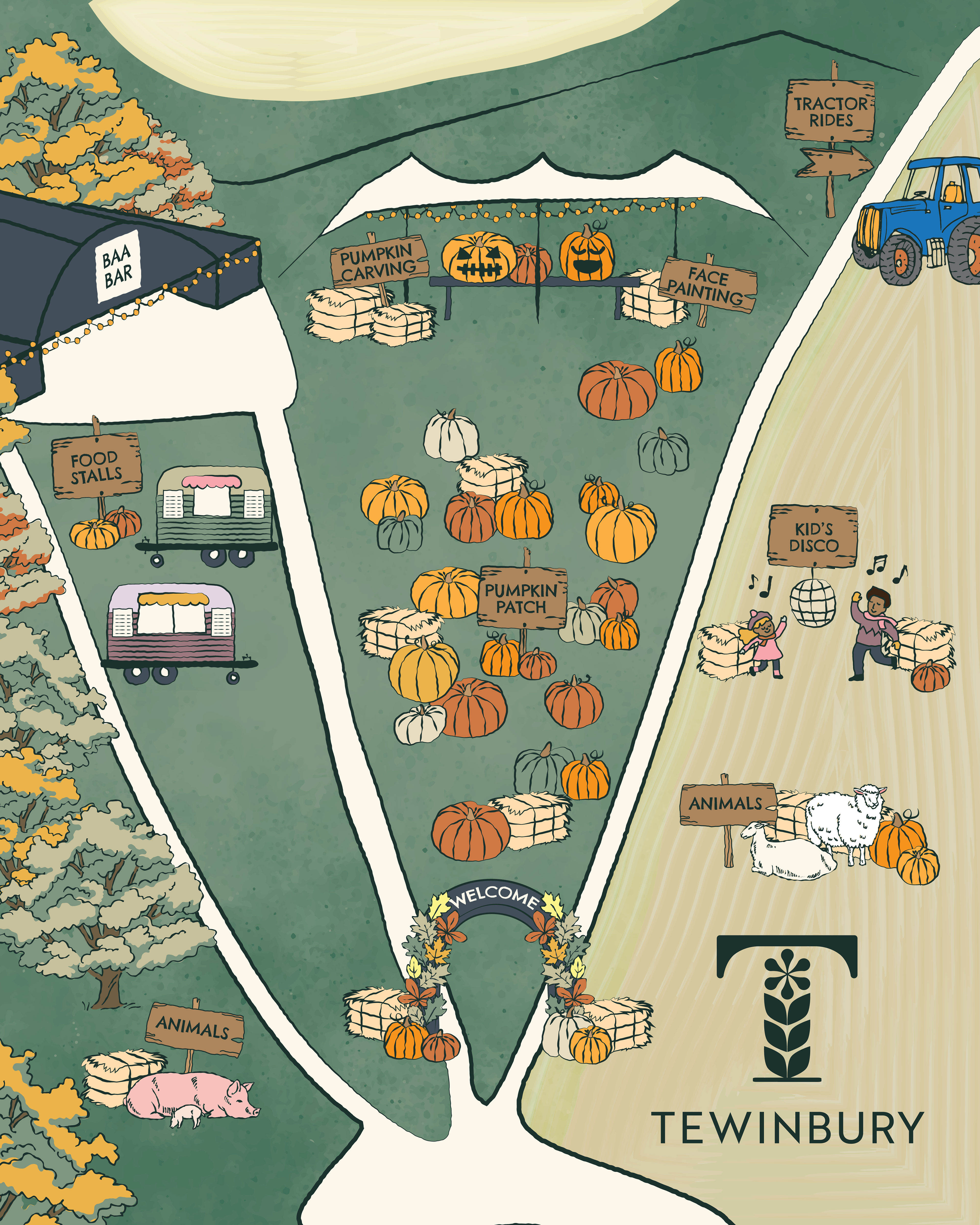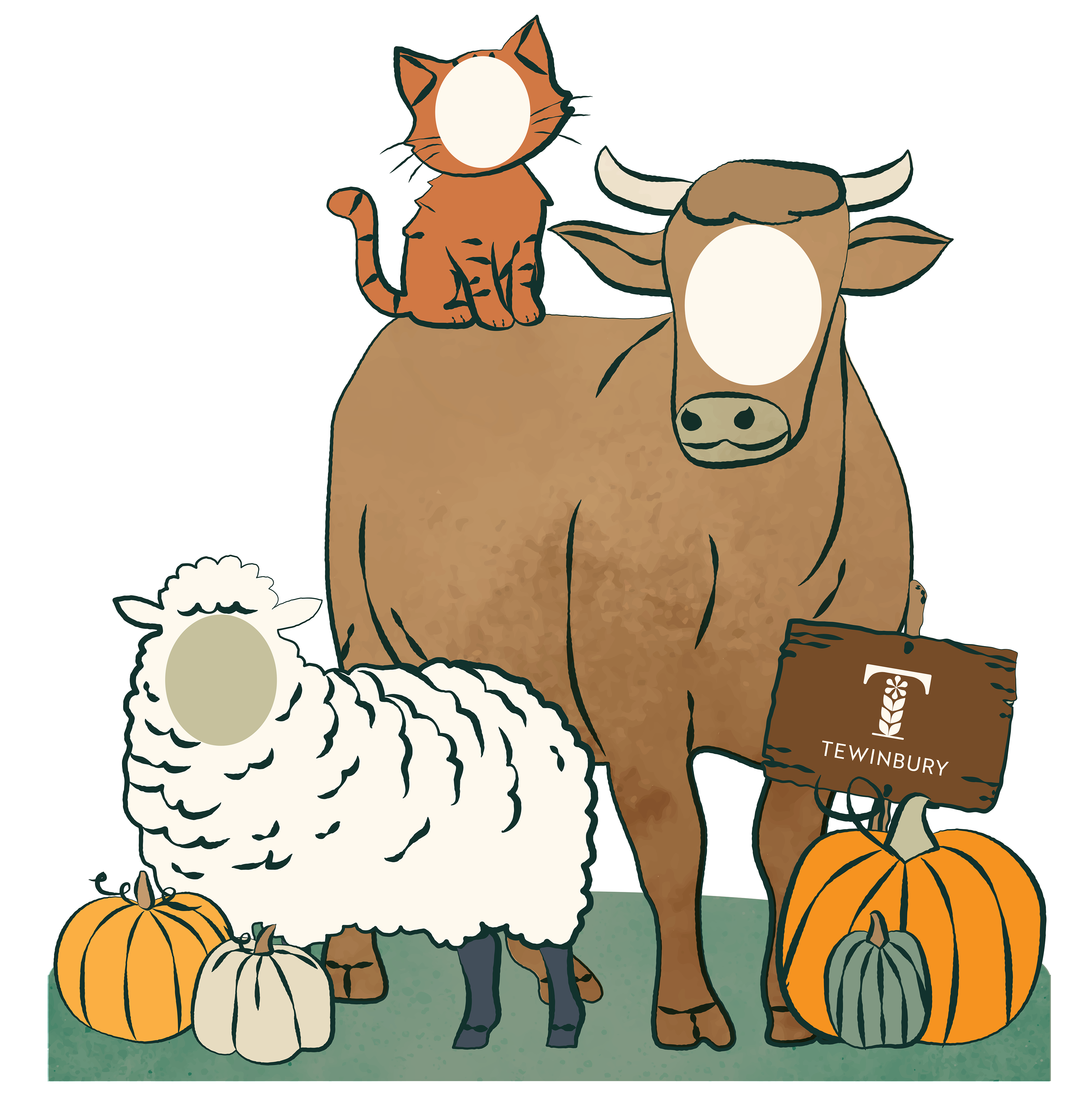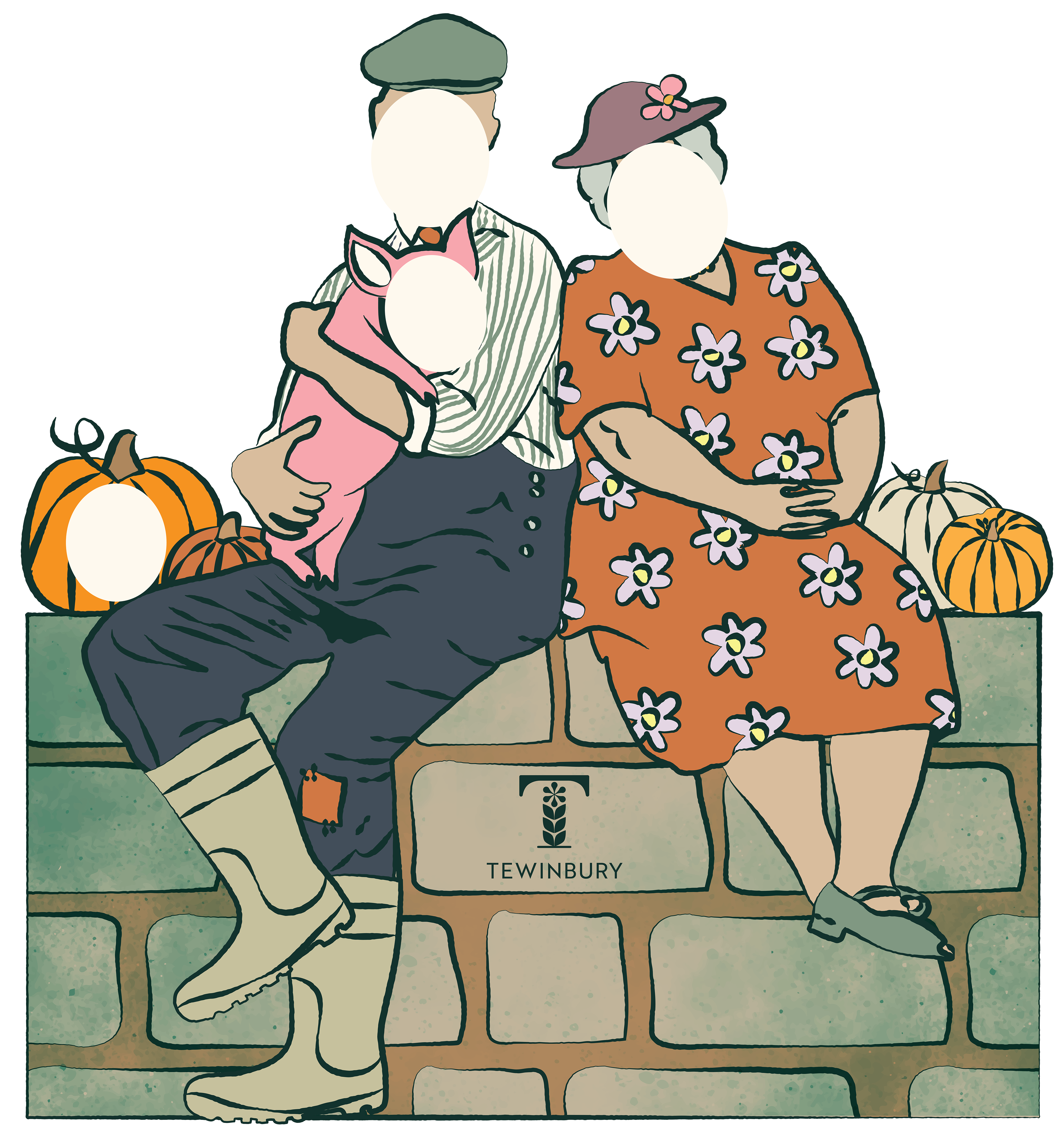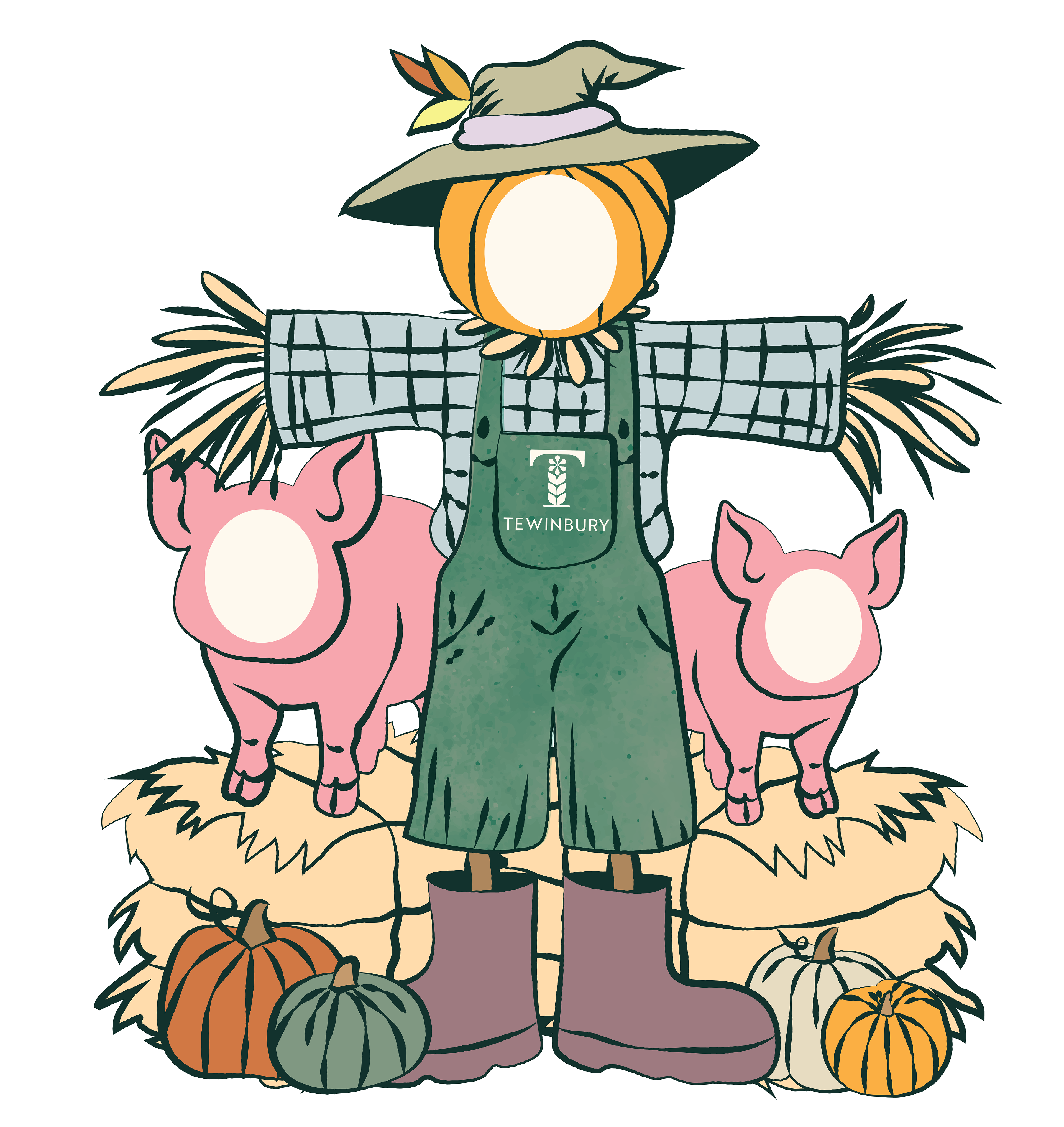 Bespoke illustrations created for Tewinbury's first annual Pumpkin Patch event. These life-sized cut outs were designed to bring some interactive fun whilst maintaining the elevated yet warm feel of Tewinbury's identity.